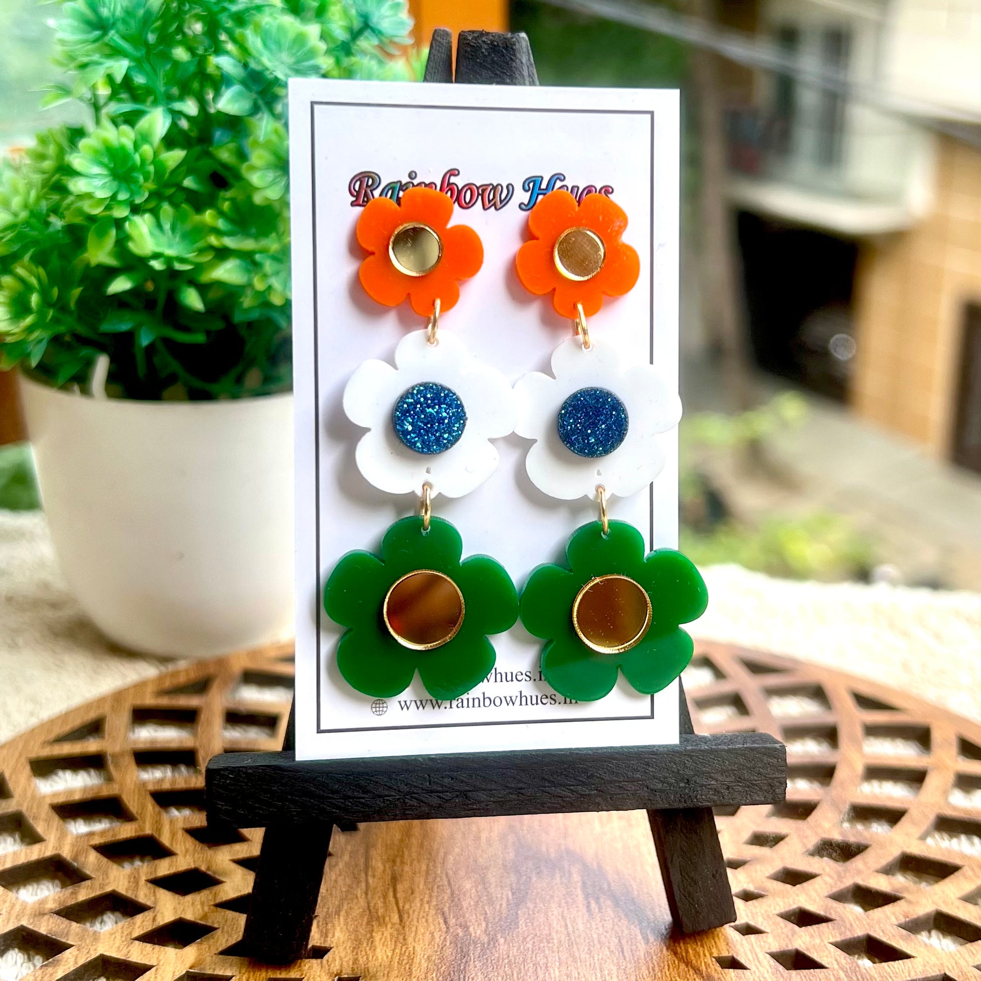 Celebrate your style with the Tiranga Flower Danglers, a vibrant accessory inspired by the colors of the Indian flag. These earrings add a touch of elegance and patriotism to any outfit, perfect for festive occasions or everyday wear. Lightweight and beautifully crafted, they offer comfort without compromising on charm. Elevate your look and express your pride with these stunning Tiranga Flower earrings.